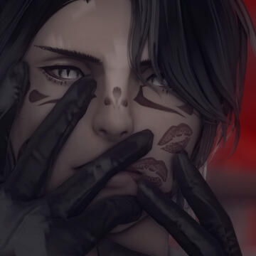red-lipped & honey-voiced; her mouth is perpetually curved into a half-moon smile: canines are short but sharp, moon-crested in the lowlight. amusement makes itself home in the darling murmur of her laugh— yet her mask hides the upper part of her features, bone-solid and decorated with strange sigils.antibody's darling director of war: war as a hunger, war as inevitable, war as the thing that yearns.